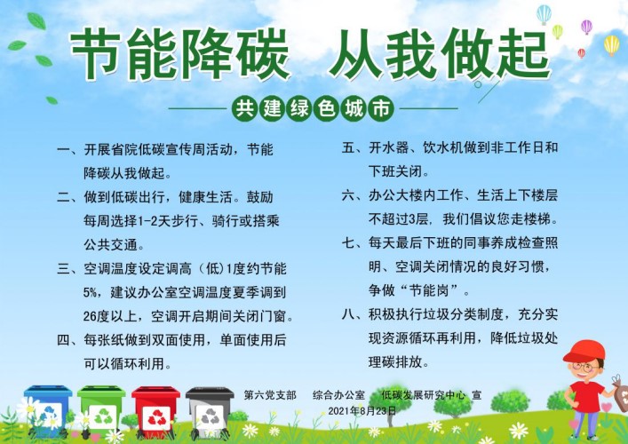 此次活動(dòng),第六黨支部與公司建筑節(jié)能設(shè)計(jì)研究所共同編寫(xiě)了“碳達(dá)峰、碳中和知識(shí)小課堂”和“節(jié)能降碳,從我做起”倡議書(shū),并通過(guò)電子顯示屏滾動(dòng)播放、企業(yè)微信全員推送、各樓層宣傳欄張貼海報(bào)等方式,多渠道多途徑普及節(jié)能降碳等知識(shí),倡導(dǎo)公司全體員工做“節(jié)能降碳,綠色發(fā)展”的踐行者。
