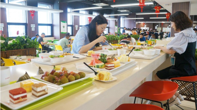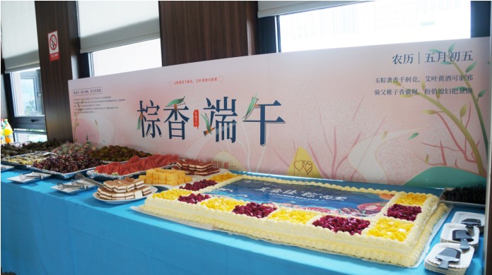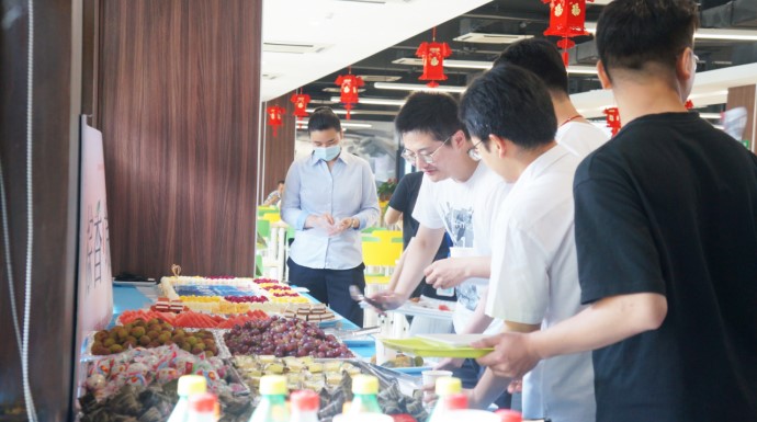 飯菜吃飽了,還有免費(fèi)提供的粽子、綠豆糕、鴨蛋等“端午美食”和蛋糕、水果、飲料等飯后甜點(diǎn)輪番上場(chǎng)。同事們一起度佳節(jié)、話日常,氣氛歡快、溫情洋溢。
