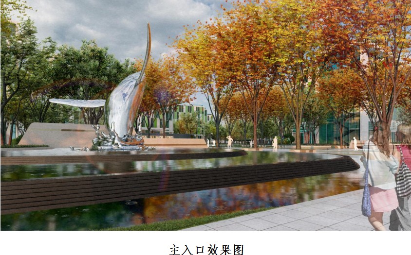 在入口展示區(qū),延續(xù)一、二期景觀風(fēng)格,以“生命之源”為主題,結(jié)合兩側(cè)城市綠帶,呈翼動之勢,舒展的形態(tài),好似雙臂一張擁抱人群,寓意展翅騰飛。