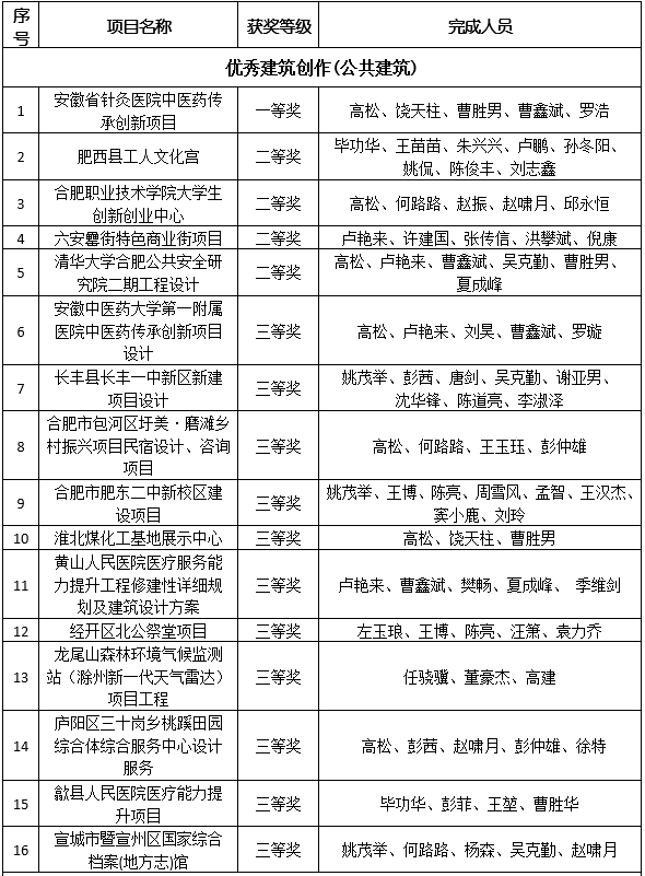 2021年9月1日,安徽省土木建筑學(xué)會(huì)發(fā)布《關(guān)于安徽省土木建筑學(xué)會(huì)第四屆創(chuàng)新獎(jiǎng)獲獎(jiǎng)項(xiàng)目的公告》。公司在本次創(chuàng)新獎(jiǎng)評(píng)選活動(dòng)中,共有41個(gè)項(xiàng)目榮獲各類各等級(jí)獎(jiǎng)項(xiàng),其中優(yōu)秀建筑創(chuàng)作獎(jiǎng)18項(xiàng),專項(xiàng)獎(jiǎng)23項(xiàng)。