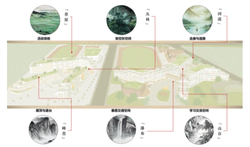 本次設(shè)計(jì)傳承歷史,提取了平塘王鄭墩遺址的商周文化甲骨文中“山”、“河”的文字意向,將筆劃融入設(shè)計(jì),以筆劃的形態(tài)搭建整體建筑空間的骨架,為校園設(shè)計(jì)注入傳統(tǒng)文化內(nèi)涵,將學(xué)校化為浩瀚知識(shí)的廣闊山河,一筆一劃,自成山河。