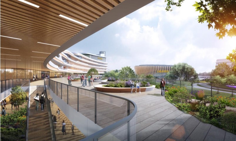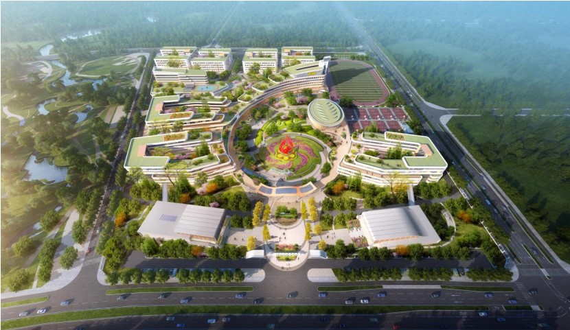 合肥六中新橋校區(qū)設(shè)計采用現(xiàn)代手法,以橫向線條為主,舒展大氣、新穎雅致、生動活潑,形成“騰飛”的態(tài)勢,寄予學(xué)生美好前程。造型既與國際機場、空港小鎮(zhèn)融合,打造走在時代前端、面向未來教育的全新合肥市第六中學(xué)!