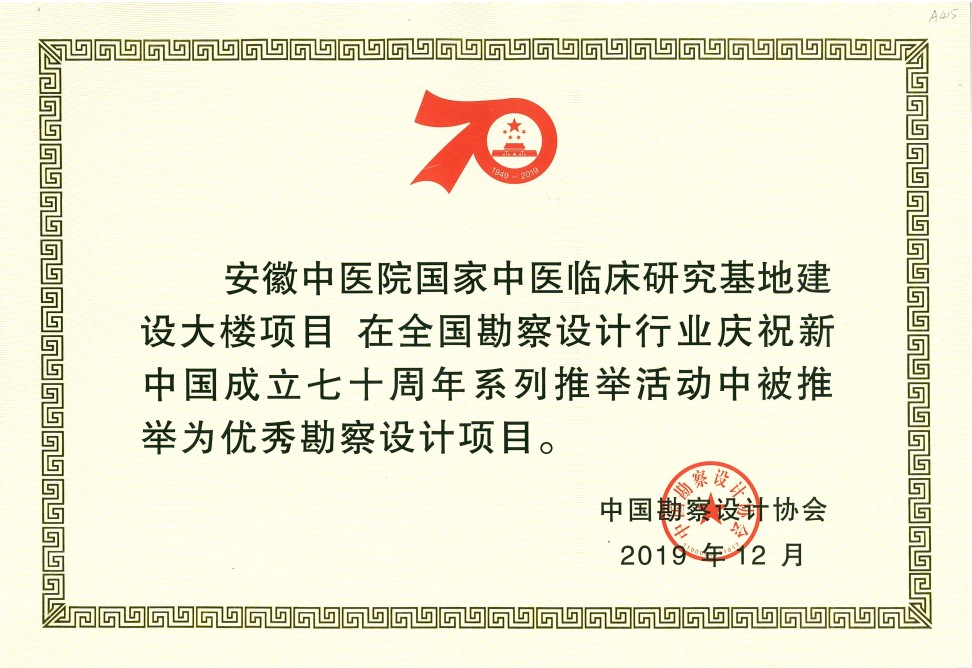 12月11日,中國勘察設(shè)計協(xié)會在全國勘察設(shè)計行業(yè)慶祝新中國成立70周年大會上發(fā)布了慶祝新中國成立70周年系列評選活動成果,我公司被評為“優(yōu)秀勘察設(shè)計企業(yè)”,高松董事長被評為“優(yōu)秀企業(yè)家”,公司設(shè)計的“安徽省博物館陳列展覽大樓”、“安徽中醫(yī)院國家中醫(yī)臨床研究基地建設(shè)大樓”2個項目被評為“優(yōu)秀勘察設(shè)計項目”。
