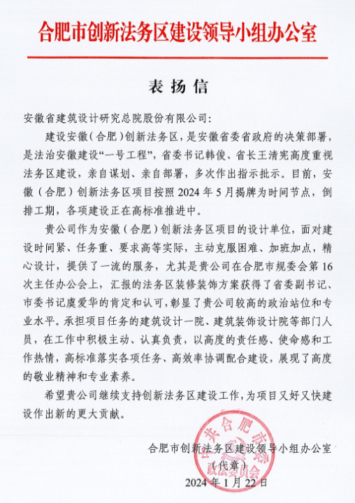 參與安徽(合肥)創(chuàng)新法務(wù)區(qū)建設(shè),公司獲表?yè)P(yáng)