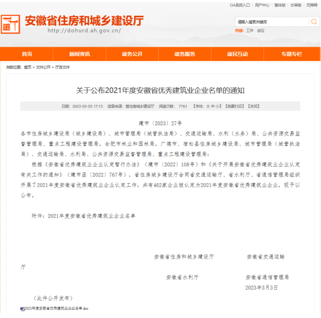 公司喜獲“2021年度安徽省優(yōu)秀建筑業(yè)企業(yè)”榮譽(yù)稱號(hào)